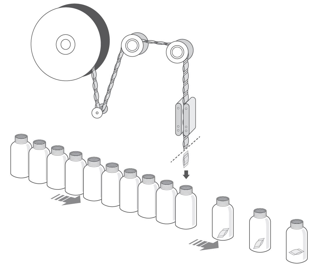 - Détection “pas de flacon” ou “bouchon en amont” : arrêt machine et redémarrage automatique.